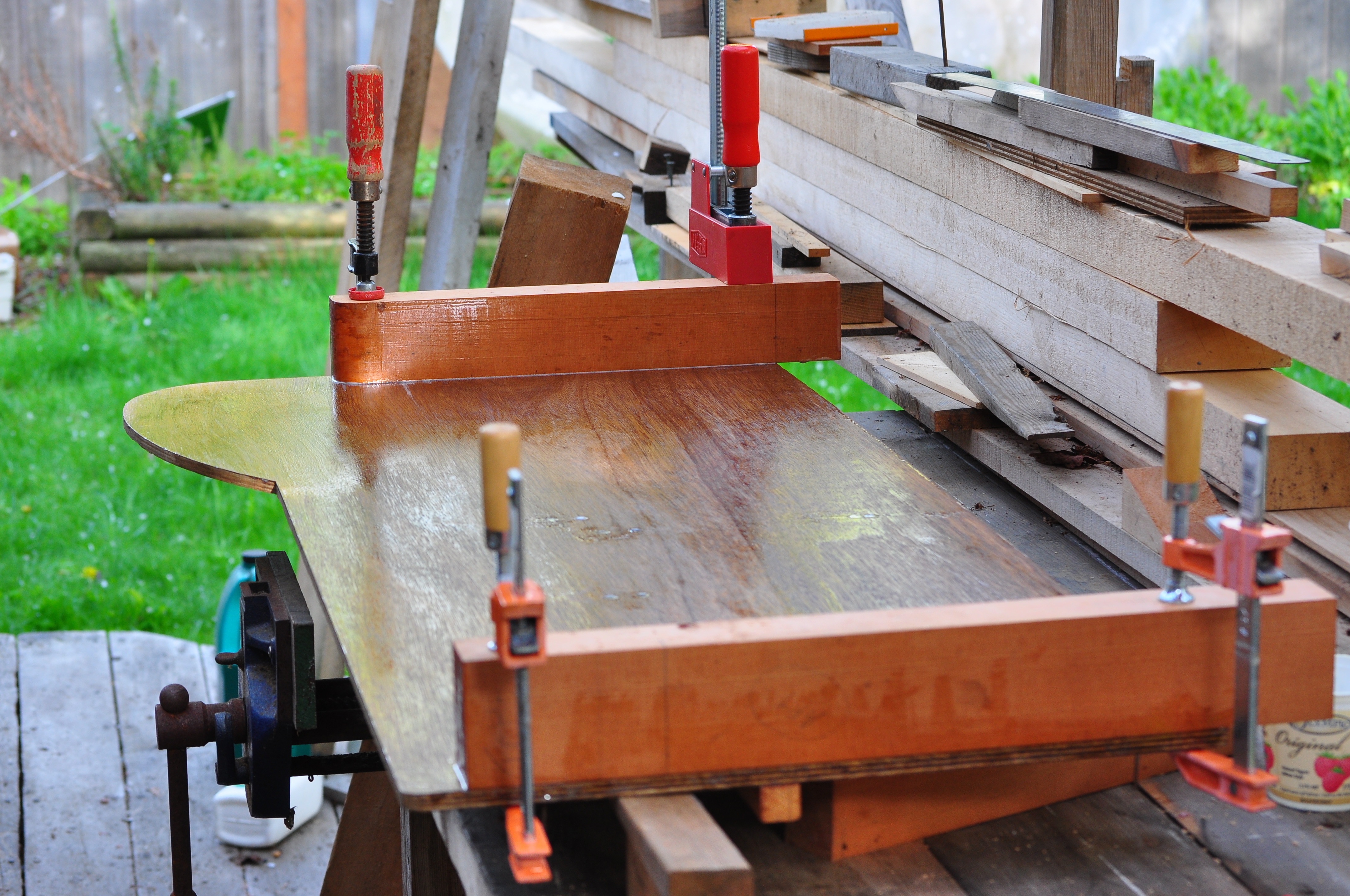 Over the last several years he’s been working on the boat off and on. We used to joke that it’s a boat in a bucket, since a lot of the parts were all standing up in a bucket. But now he’s starting to glue and screw the bits together, and soon we’ll have something that looks much more boat-like to admire from the kitchen window.
